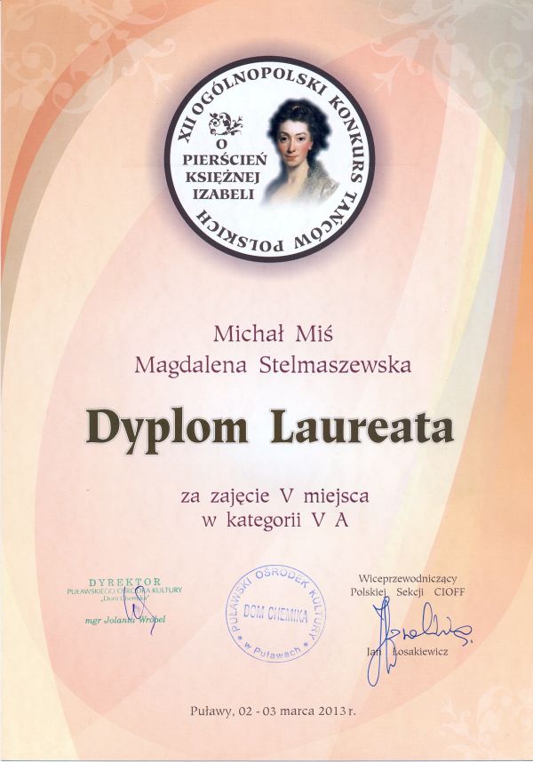 W Puławach w dniach 2.03 – 3.03.2013r. odbył się XII Ogólnopolski Konkurs Tańców Polskich „O pierścień Księżnej Izabeli”. W turnieju wzięło udział 200 par z całego kraju wśród których byli uczniowie naszej szkoły Magdalena Stelmaszewska i Michał Miś tańcząc w kategorii VA (18 – 30 lat) zajęli wysokie V miejsce rywalizując z zespołami studenckimi takimi jak ZPiT UW „Warszawianka” i ZPiT UJ „Słowianki”. Natomiast Jowita Grenda i Przemysław Rzeszutek po długiej nieobecności na turniejach zajęli w kategorii IVB (16-18 lat) XII miejsce. Gratulujemy!