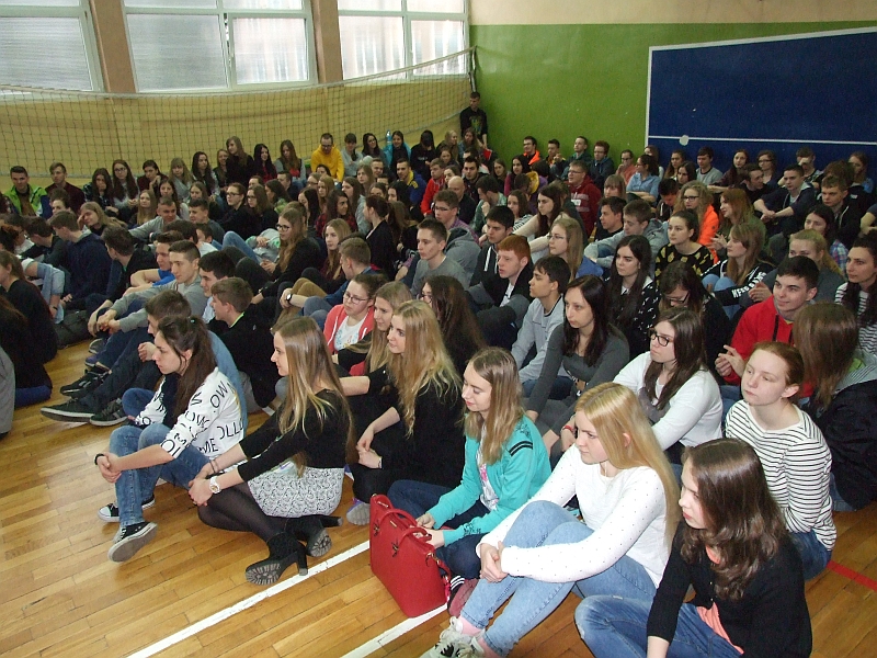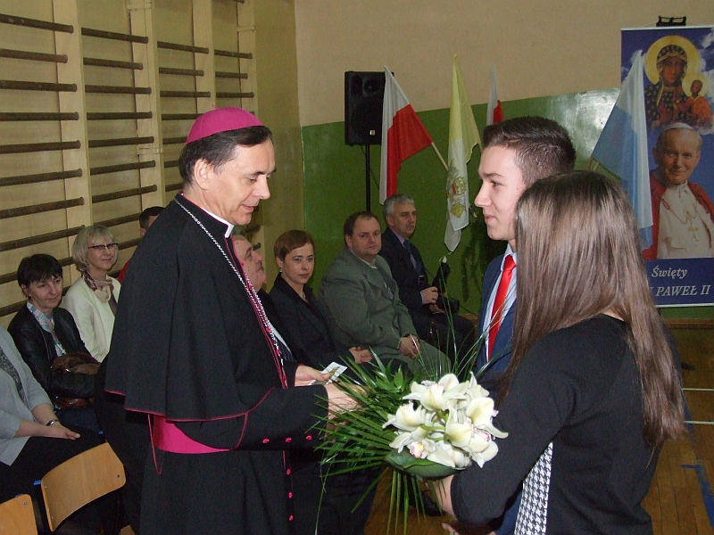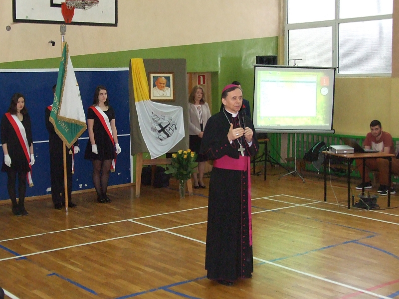 Przybył w towarzystwie Księdza Dziekana Jerzego Kosa. Goście uczestniczyli w uroczystym apelu przygotowanym przez ks. Tomasza Nuckowskiego i ks. Daniela Koprowskiego. Ks. Biskup wygłosił do młodzieży krótką wypowiedź, w której odniósł się m.in. do zbliżających się Światowych Dni Młodzieży w Krakowie i przyjazdu papieża Franciszka. Następnie uczniowie klasy 2d zaprezentowali fragmenty „Tryptyku rzymskiego” Jana Pawła II. Na zakończenie apelu Ksiądz Biskup, po krótkiej modlitwie, udzielił błogosławieństwa wszystkim zebranym i udał się na zaplanowane spotkanie z nauczycielami i pracownikami obsługi.