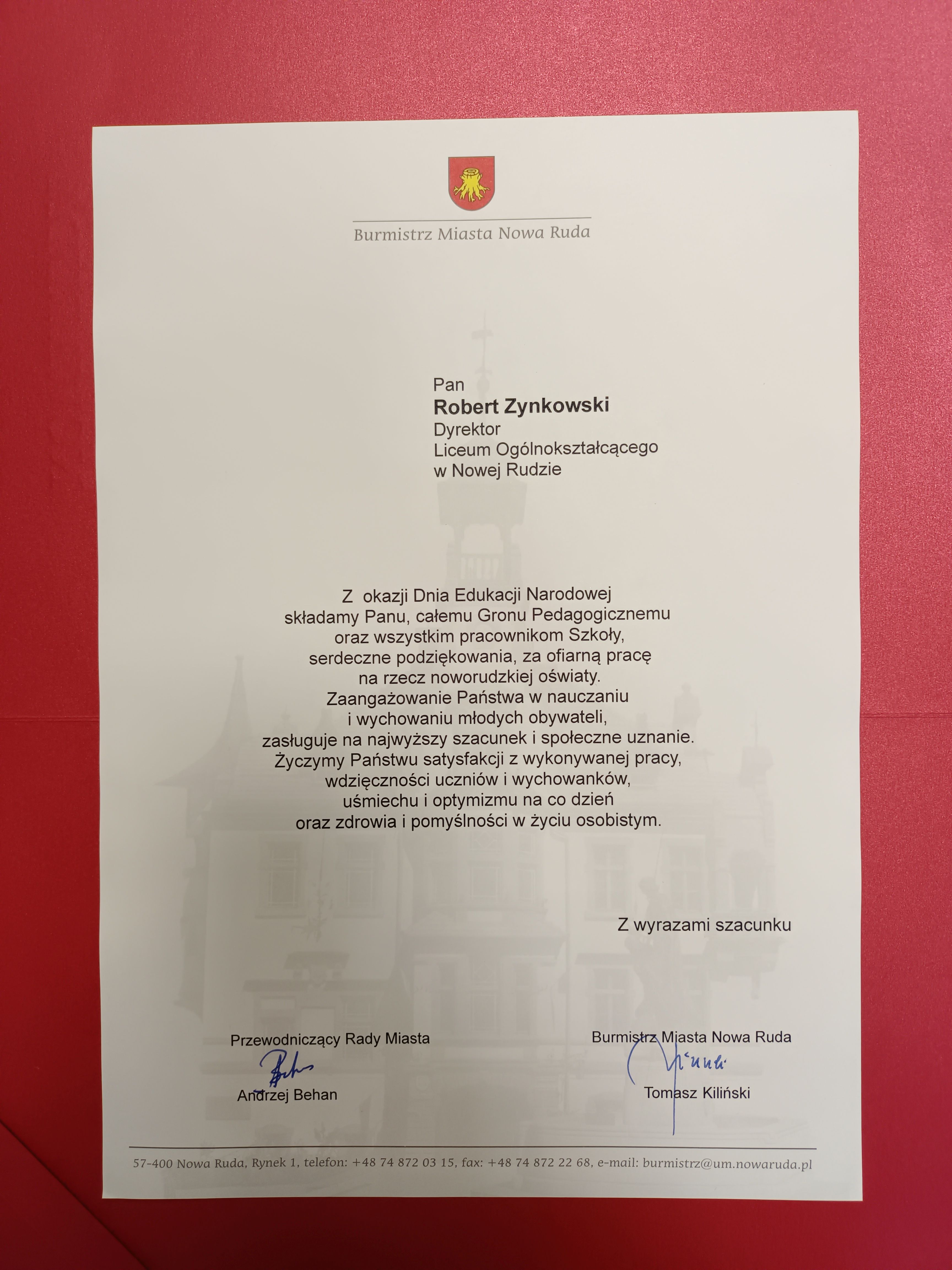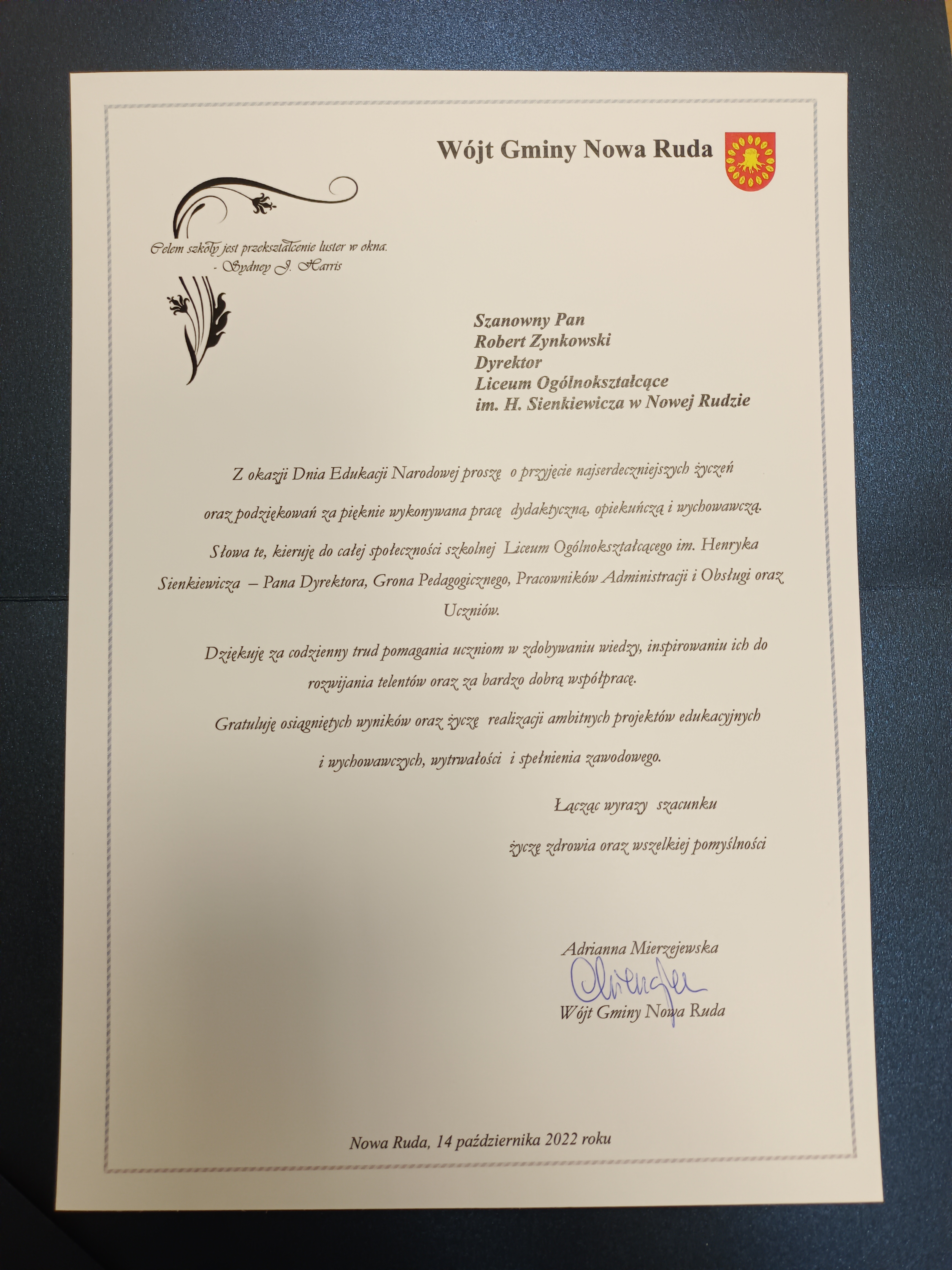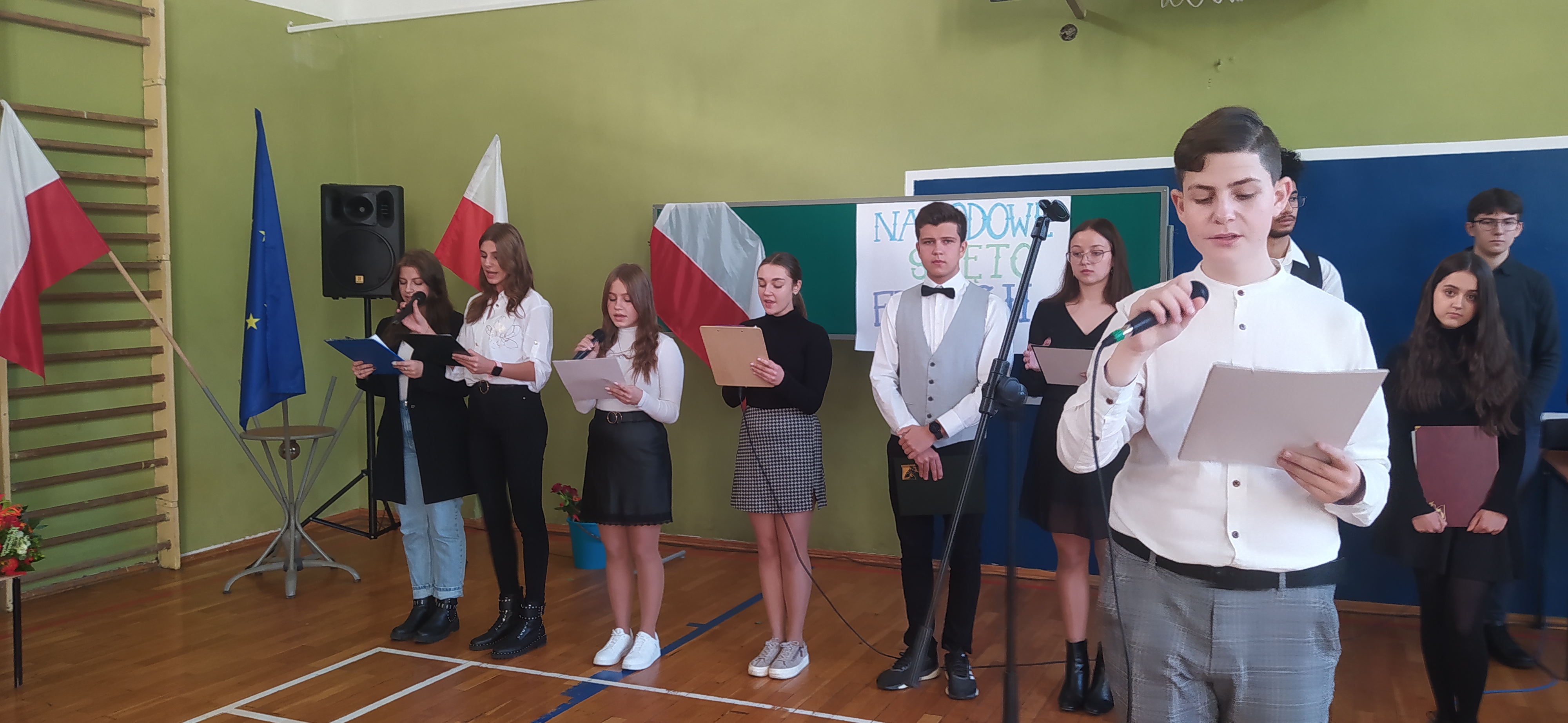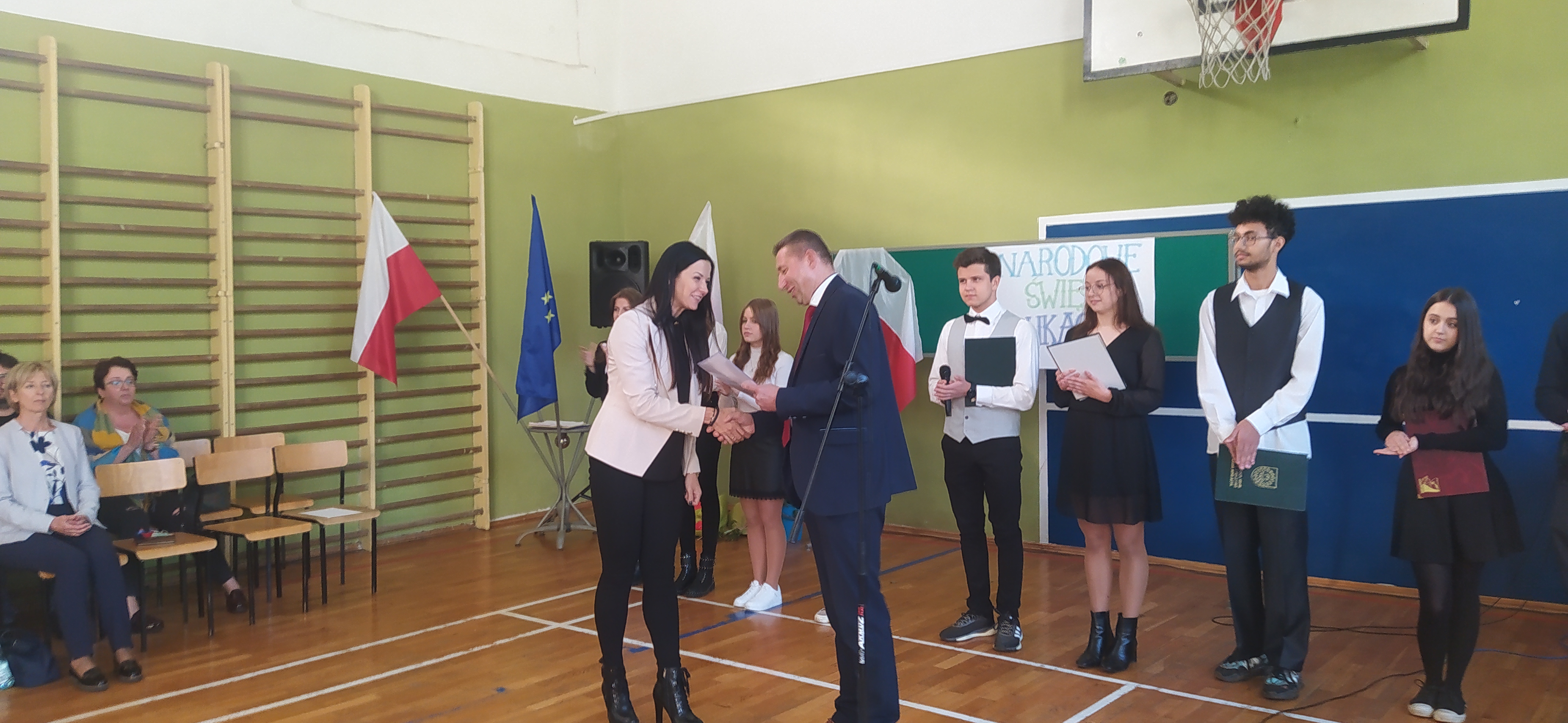 17 października 2022r. mieliśmy przyjemność uczestniczyć w uroczystej akademii z okazji Święta Edukacji Narodowej, w której uczniowie podziękowali pedagogom i pracownikom szkoły za trud włożony w ich naukę i wychowanie.   Pod opieką p. Lucyny Stramy i p. Marzanny Pietrzak przygotowali wiązankę życzeń w postaci refleksyjnych wierszy i piosenek oraz utworów muzycznych, wykonanych na trąbce i na pianinie cyfrowym.   Pan dyrektor Robert Zynkowski wręczył Nagrody Dyrektora następującym nauczycielom: p. Agacie Hryciuk, p. Lucynie Stramie, p. Ninie Zabłockiej, p. Magdalenie Rydlewskiej-Majewskiej, p. Witoldowi Telusowi. Szczególne wyróżnienia w postaci Nagrody Starosty otrzymali: p. Robert Zynkowski i p. Bożena Bojczuk.   Ogłoszono również skład nowego Samorządu Uczniowskiego. Funkcję przewodniczącej pełni Maja Grzebień, zastępcy Karolina Białek, skarbnika Oliwia Szablewska, członkowie rady to Aleksandra Pajor i Karolina Muzyka. Opiekunem Samorządu Uczniowskiego została p. Andżelika Warszczuk, a Rzecznikiem Praw Ucznia ks. Michał Pietraszek.   Był to wyjątkowy dzień całej społeczności szkolnej.