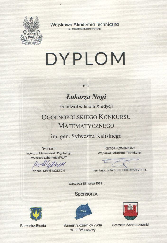 15 marca 2019 roku w Wojskowej Akademii Technicznej w Warszawie odbył się finał X edycji Ogólnopolskiego Konkursu Matematycznego im. gen. Sylwestra Kaliskiego, w którym uczeń naszej szkoły Łukasz Noga zajął 11 miejsce w Polsce. Opiekunem Łukasza był dyrektor szkoły Robert Zynkowski. To wielkie osiągnięcie dla naszego Liceum. Łukaszowi składamy gratulacje i życzymy dalszych sukcesów. |