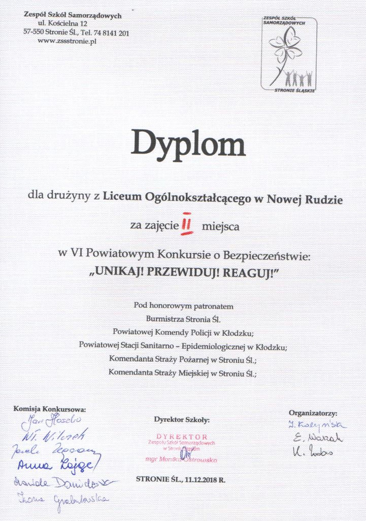 We wtorek 11 grudnia odbył się w Zespole Szkół Samorządowym w Stroniu Śląskim powiatowy konkurs "UNIKAJ! PRZEWIDUJ! REAGUJ!". Naszą szkołę reprezentowało troje uczniów: Martyna Bywalec i Szymon Kulig z kl. I c oraz Karolina Kózka z kl. II b. Nasza drużyna przygotowywana przez pana Andrzeja Behana zajęła II miejsce, ustępując tylko 1 punktem reprezentacji z Bystrzycy Kłodzkiej. Uczestnikom i opiekunowi serdecznie gratulujemy.