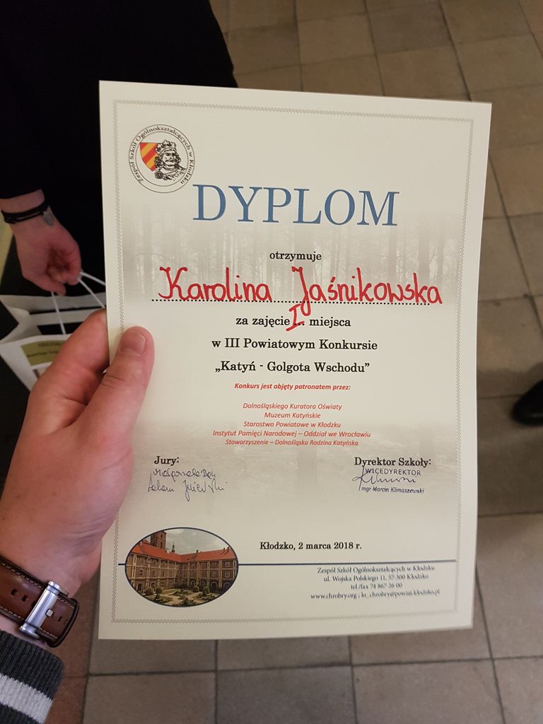Dnia 2 marca br. w gmachu Liceum Ogólnokształcącego w Kłodzku odbył się III edycja Powiatowego Konkursu Historycznego "Katyń - Golgota Wschodu", w którym wzięło udział dwoje uczniów z naszej szkoły: Karolina Jaśnikowska z kl. Ia oraz Karol Iwanicki z kl. IIb. Miło poinformować, iż I miejsce w tym konkursie w pionie szkół licealnych zajęła Karolina Jaśnikowska wykazując się fenomenalną wiedzą w tym temacie. Uczniowie byli przygotowywani przez pana Andrzeja Behana. Gratulujemy!  |