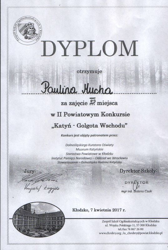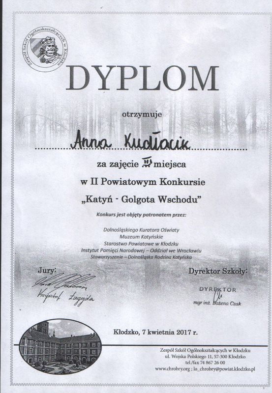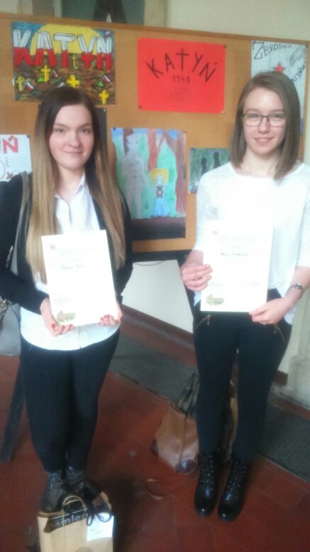 Trzecie miejsce zajęły drużynowo nasze uczennice w powiatowym konkursie "Katyń - Golgota Wschodu", który odbył się 7 kwietnia br. w Zespole Szkół Ogólnokształcących w Kłodzku. Nasze dziewczyny w składzie: Paulina Mucha ( 3b ) i Anna Kudłacik ( 1c ) pod opieką pana Andrzej Behana uległy wprawdzie drużynie "Chrobrego" i Zespołu Szkół Społecznych w Kłodzku, jednak wyprzedziły sześć innych reprezentacji szkół powiatu kłodzkiego, wykazując się dobrą wiedzą na temat zagadnienia, które do dzisiaj jest mocno kultywowane zwłaszcza w organizacjach "rodzin katyńskich". Całość imprezy uświetnił występ artystyczny młodzieży kłodzkiego LO. Zatem powtórzyły sukces z ubiegłego roku. Serdecznie gratulujemy.