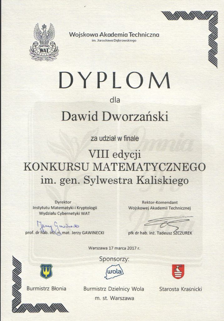 17 marca 2017 roku uczniowie noworudzkiego liceum ogólnokształcącego im. Henryka Sienkiewicza w Nowej Rudzie: Dawid Dworzański z klasy 3a i Łukasz Noga z klasy 1a wzięli udział w finale Konkursu Matematycznego im. gen. Sylwestra Kaliskiego. Konkurs był zorganizowany przez Wyższą Akademię Techniczną w Warszawie. Dawid Dworzański zajął 15 miejsce, a Łukasz Noga – 55. W finale ogólnopolskiego konkursu wzięło udział łącznie 104 uczniów z całej Polski. Naszym uczniom gratulujemy dobrego wyniku.  |