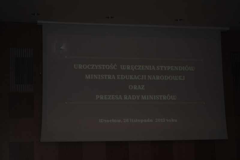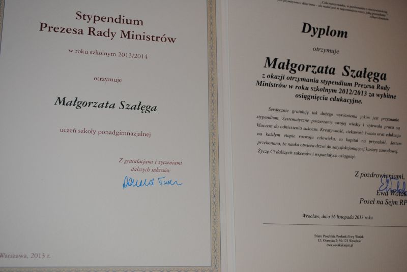 Dnia 26 listopada br.  w auli Uniwersytetu Przyrodniczego we WrocÅ‚awiu odbyÅ‚a siÄ™ uroczystość przyznania stypendiów Prezesa Rady Ministrów i Ministra Edukacji Narodowej. WÅ›ród wielu mÅ‚odych i uzdolnionych uczniów szkół Å›rednich znalazÅ‚a siÄ™ także uczennica naszej szkoÅ‚y, uczÄ™szczajÄ…ca do klasy 2c - MaÅ‚gorzata Szałęga, która w roku szkolnym 2012/2013 uzyskaÅ‚a najwyższÄ… Å›redniÄ… ocen. Stypendium Prezesa Rady Ministrów jest co roku przyznawane jednej wybitnie uzdolnionej osobie wytypowanej przez radÄ™ pedagogicznÄ… danej szkoÅ‚y. Oprócz przedstawicieli kuratorium i wÅ‚adz samorzÄ…dowych w uroczystoÅ›ci uczestniczyli również dyrektorzy szkół (m.in pani Marzanna Pietrzak), nauczyciele oraz rodzice.Â