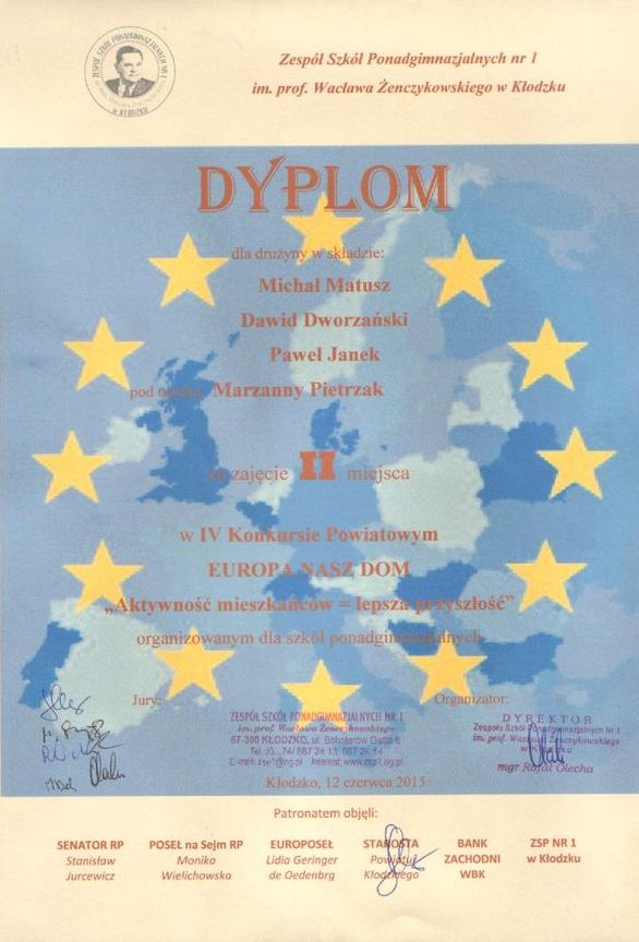 Dnia 12 czerwca 2015 roku uczniowie naszej szkoły w osobach: Paweł Janek, Michał Matusz i Dawid Dworzański wzięli udział w finałowym etapie konkursu: "Europa nasz dom, Aktywność mieszkańców = lepsza przyszłość", który odbył się w Zespole Szkół Ponadgimnazjalnych nr 1 w Kłodzku. Nasz zespół zajął drugie miejsce. Gratulujemy.