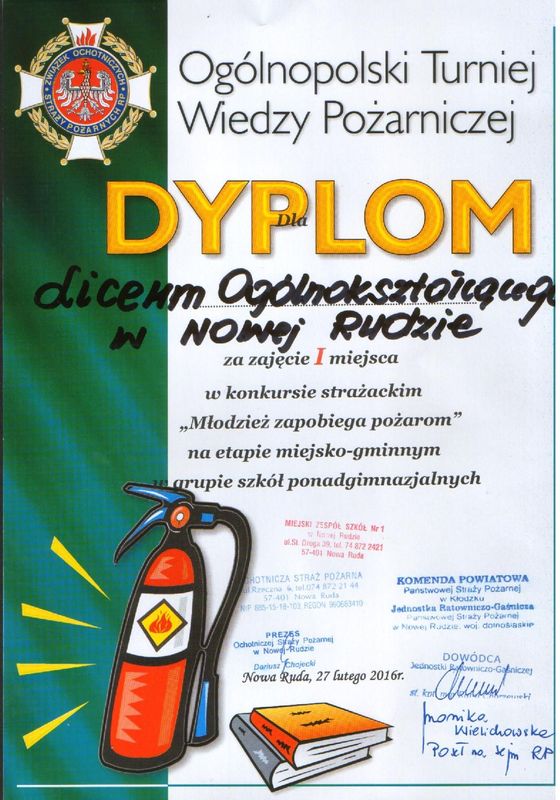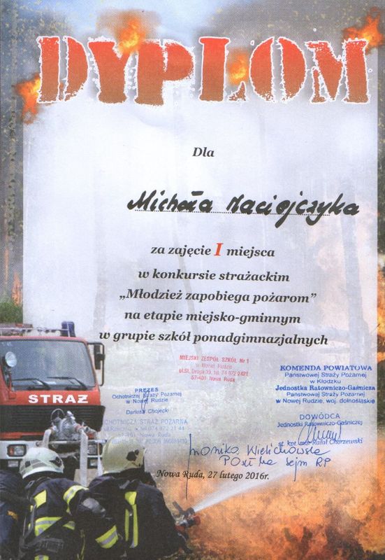 W sobotÄ™ 27 lutego odbyÅ‚ siÄ™ turniej miejsko - gminny "MÅ‚odzież zapobiega pożarom" MiÅ‚o nam poinformować, iż w pionie szkół ponadgimnazjalnych drużyna naszej szkoÅ‚y w skÅ‚adzie MichaÅ‚ Maciejczyk ( 3 b ), Bartek Cukla ( 2 b ) oraz Maciek Pacak ( 2 a ) zajęła 1 miejsce zdobywajÄ…c dla szkoÅ‚y puchar przechodni. Indywidualnie w tym pionie zwyciężyÅ‚ MichaÅ‚ Maciejczyk, drugie miejsce zajÄ…Å‚ Bartek Cukla i oni obaj wystÄ…piÄ… w kolejnym konkursie, tym razem na etapie powiatowym. Niewiele zabrakÅ‚o Maćkowi Pacakowi, który zajÄ…Å‚ również premiowane 4 miejsce. Za swoje osiÄ…gniÄ™cia uczniowie otrzymali wartoÅ›ciowe nagrody. Drużyna wystÄ…piÅ‚a pod opiekÄ… pana mgra Andrzeja Behana. Â
