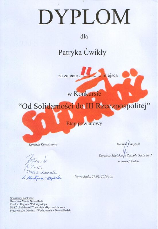 Dnia 27.02.2016 w MZS nr 1 w Nowej Rudzie Drogosławiu odbył się etap powiatowy konkursu "Od Solidarności do III Rzeczpospolitej". Uczniowie naszej szkoły, Martyna Zdrojek i Patryk Ćwikła zajęli 2 miejsce i tym samym zakwalifikowali się do etapu wojewódzkiego we Wrocławiu, który odbędzie się 02.04.2016.