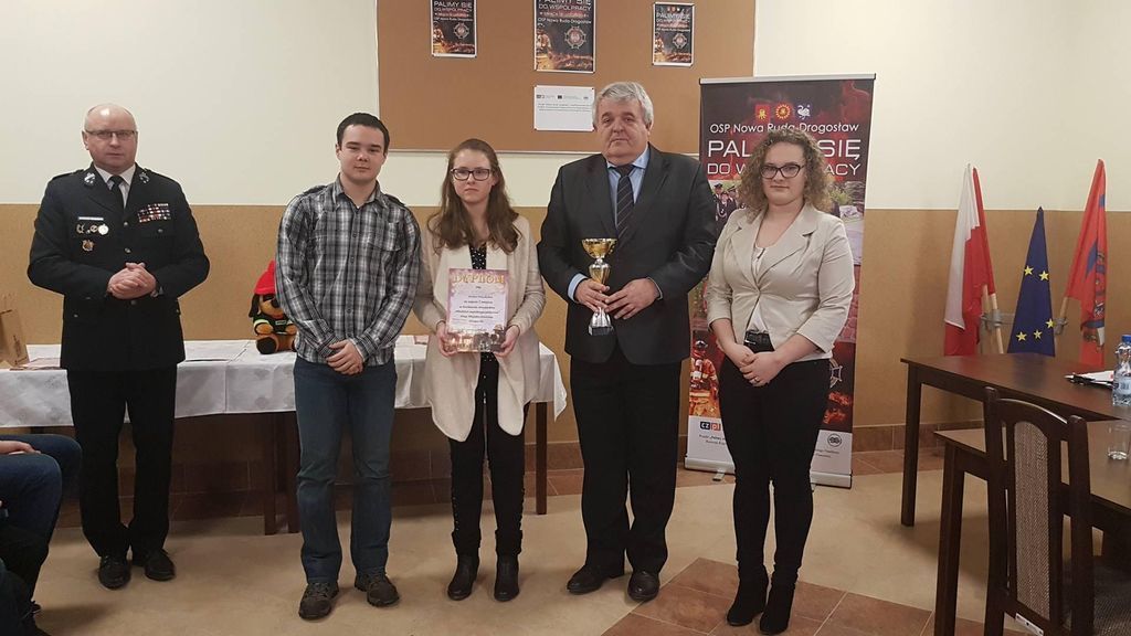 W dniu 10 lutego br. w obiektach Szkoły Podstawowej nr 6 oraz zrewitalizowanym budynku Ochotniczej Straży Pożarnej w Nowej Rudzie - Drogosławiu odbyły się miejsko - gminne zawody "Młodzież zapobiega pożarom". Naszą szkołę reprezentowało pod opieką p. Andrzeja Behana troje uczniów: Karolina Kózka z kl. I b, Natalia Muzyka z II a oraz Adrian Trybus z 2 c. Miło nam poinformować, iż zwycięzcą w pionie szkół ponadgimnazjalnych została Karolina Kózka i ona będzie reprezentować naszą szkołę w etapie powiatowym, który odbędzie się 10 marca. Warto dodać, iż również 1 miejsce drużynowo zajęła nasza szkoła, otrzymując puchar przechodni. Gratulujemy!