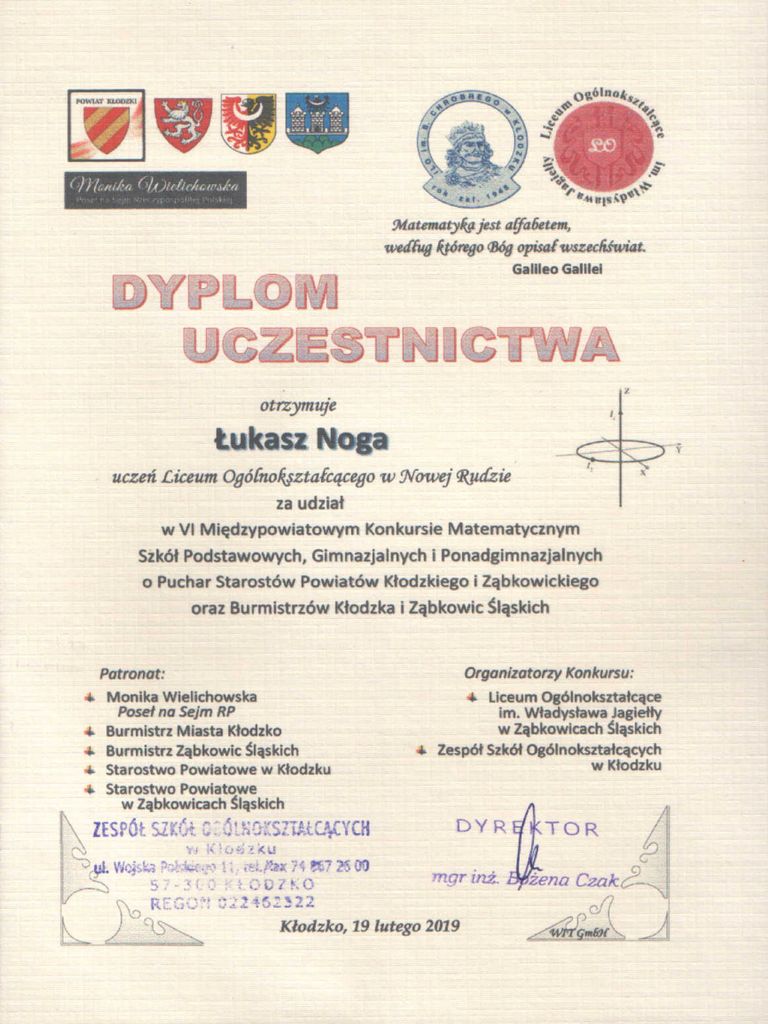 Dnia 19 lutego 2019 r. w Zespole Szkół Ogólnokształcących w Kłodzku miał miejsce półfinał VI MIĘDZYPOWIATOWEGO KONKURSU MATEMATYCZNEGO SZKÓŁ PODSTAWOWYCH, GIMNZJAZJALNYCH I PONADGIMNAZJALNYCH. Do finału w swojej kategorii, z pierwszego miejsca, z maksymalną liczbą punktów, zakwalifikował się uczeń naszego liceum Łukasz Noga z klasy 3a. |