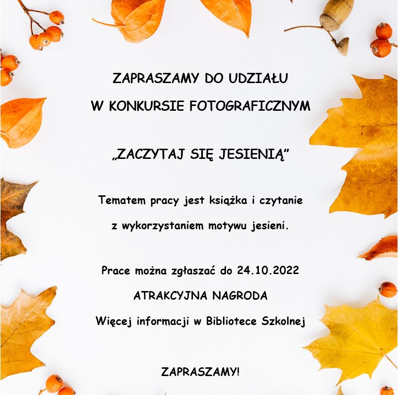Zapraszamy do udziału w konkursie fotograficznym. Tematem pracy jest książka i czytanie z wykorzystaniem motywu jesieni. Więcej informacji na załączonym obrazku oraz regulaminie konkursu