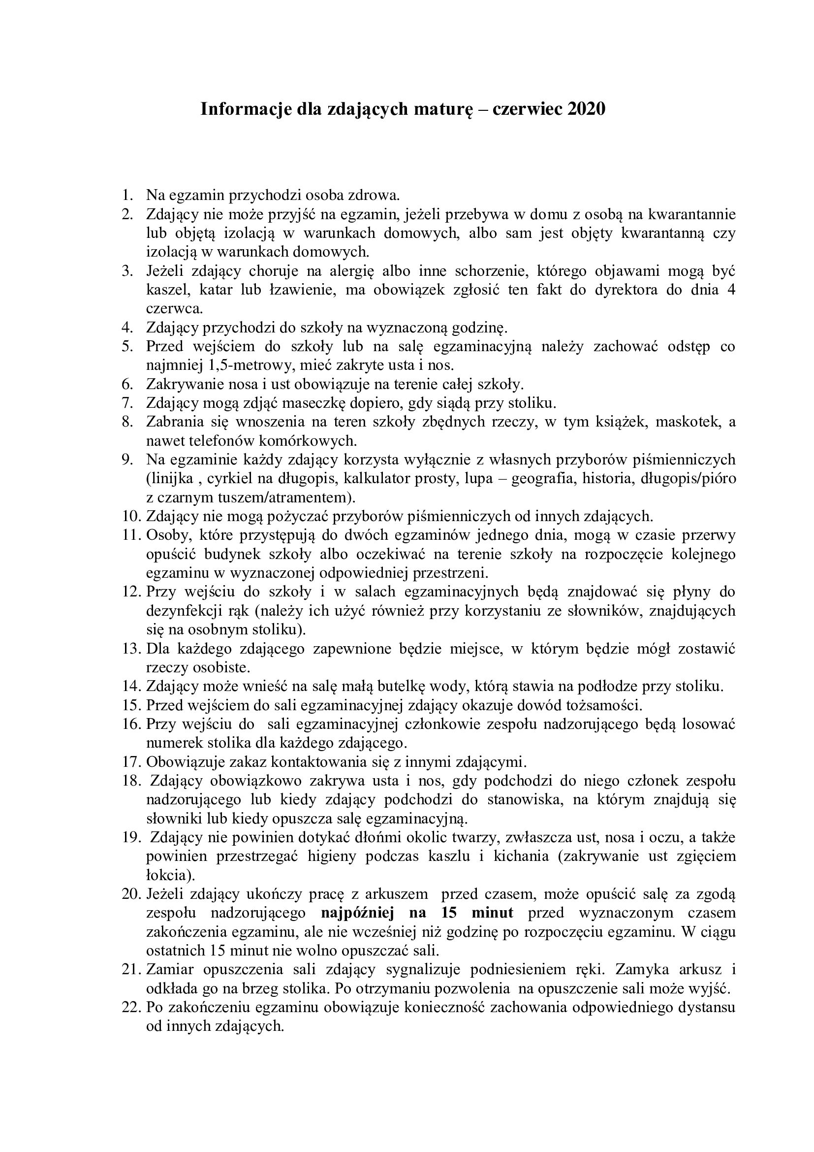 INFORMACJE DLA ZDAJĄCYCH MATURĘ - CZERWIEC 2020 |