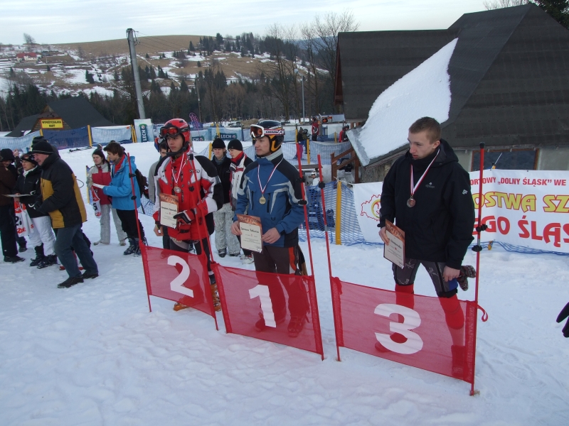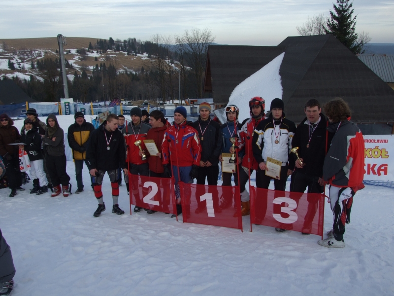 Piękny sukces odnieśli nasi uczniowie w finałowych zawodach dolnośląskiej Licealiady SZS w narciarstwie alpejskim, które odbyły się w czwartek 10 lutego na stokach Dwójki-Nartoramy w Zieleńcu. Na dobrze przygotowanej trasie slalomu giganta ustawionego przez instruktorów Szkoły LE-SKI, przy słonecznej pogodzie rywalizowało 79 narciarzy z dwudziestu sześciu dolnośląskich szkół ponadgimnazjalnych. Znakomite czasy w dwóch przejazdach osiągnęli reprezentanci naszego „Ogólniaka”. Damian Piekarz – uczeń kl.1a wynikiem 53,26 sek. zdobył tytuł Mistrza Licealiady i Remigiusz Szymaniak – uczeń kl.1c, który uległ swojemu koledze z zespołu o 0,06 sek i zdobył srebrny medal. Trzeci z naszych reprezentantów Radosław Widurek nie ukończył drugiego przejazdu. Do klasyfikacji drużynowej liczone były łączne czasy przejazdów dwóch najlepszych alpejczyków z każdej szkoły. Mając dwie pierwsze lokaty indywidualne zdobyliśmy po raz pierwszy w historii naszej szkoły tytuł mistrzowski na szczeblu dolnośląskim w narciarstwie alpejskim. Wielkie gratulacje dla naszych chłopców!