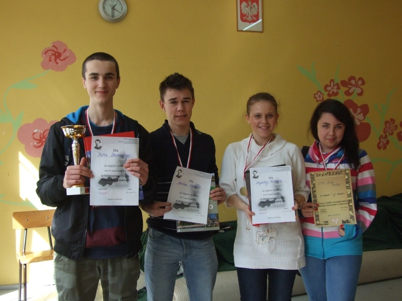 Po ubiegłorocznych sukcesach naszej reprezentacji szkolnej w szachach drużynowych w tym roku również liczyliśmy na powtórkę i kolejne emocjonujące zmagania. Nasi uczniowie ponownie nie zawiedli oczekiwań i świetnie rozgrywając swoje partie w finale powiatowym Licealiady SZS oraz na szczeblu finału strefy wałbrzyskiej wywalczyli złote medale. W Kłodzku pokonali zdecydowanie wszystkie zespoły po 4:0, natomiast w rywalizacji strefowej w Świdnicy, systemem „szwajcarskim” zdominowali ośmiu swoich przeciwników ze szkół wałbrzyskich, świdnickich, ząbkowickich i dzierżoniowskich tracąc zaledwie 1 duży pkt. meczowy – awansując wraz z II LO Wałbrzych do finału dolnośląskiego. W Książu pośród ośmiu finalistów Licealiady dolnośląskiej nasza reprezentacja grająca w składzie: Marcin Szydełko, Magdalena Łaszewicz, Piotr Baczewski i Paulina Pakulska zajęła czwarte miejsce. Gratulujemy! |