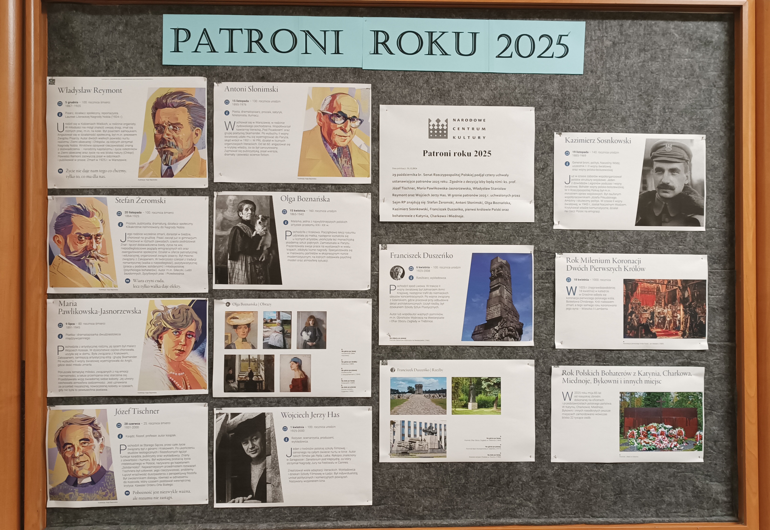 Gazetka przygotowana przez bibliotekę prezentowała sylwetki patronów roku 2025, którzy zostali wybrani przez Senat Rzeczypospolitej Polskiej. Zgodnie z decyzją Izby zostali nimi: ks. prof. Józef Tischner, Maria Pawlikowska-Jasnorzewska, Władysław Stanisław Reymont oraz Wojciech Jerzy Has. Natomiast wśród patronów 2025 r. uchwalonych przez Sejm RP znajdowali się: Stefan Żeromski, Antoni Słonimski, Olga Boznańska, Kazimierz Sosnkowski, Franciszek Duszeńko, pierwsi królowie Polski oraz bohaterowie z Katynia, Charkowa i Miednoje. Przygotowane materiały zawierały informacje o twórcach oraz przypominały wymienione wydarzenia historyczne. |