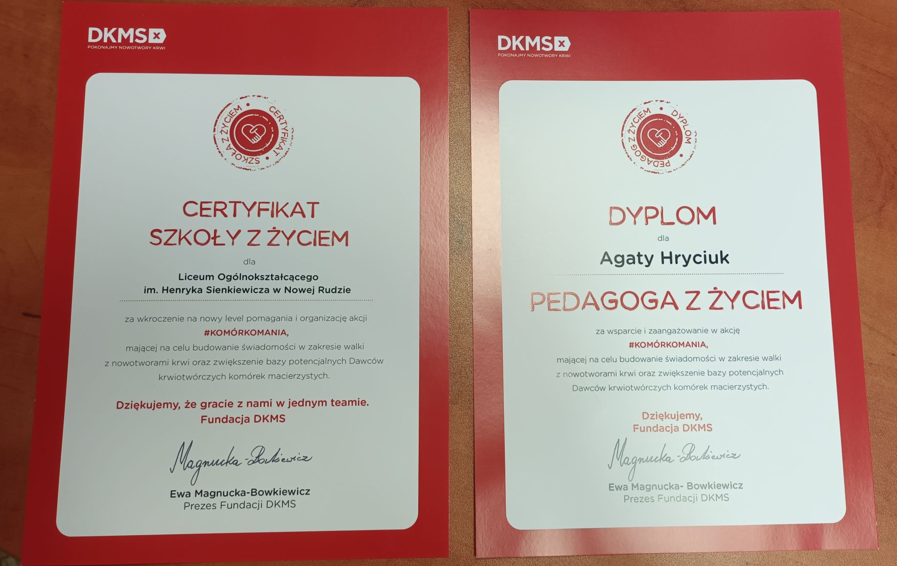 Miło nam poinformować, że nasze liceum otrzymało Certyfikat Szkoły z życiem, za udział w akcji „komórkomania”, mającej na celu budowanie świadomości w zakresie walki z nowotworami krwi oraz zwiększenie bazy potencjalnych Dawców krwiotwórczych komórek macierzystych. Natomiast pani Agata Hryciuk otrzymała tytuł "Pedagoga z życiem" za wsparcie i zaangażowanie w tą akcję.