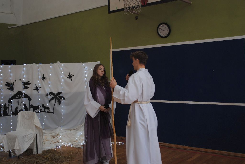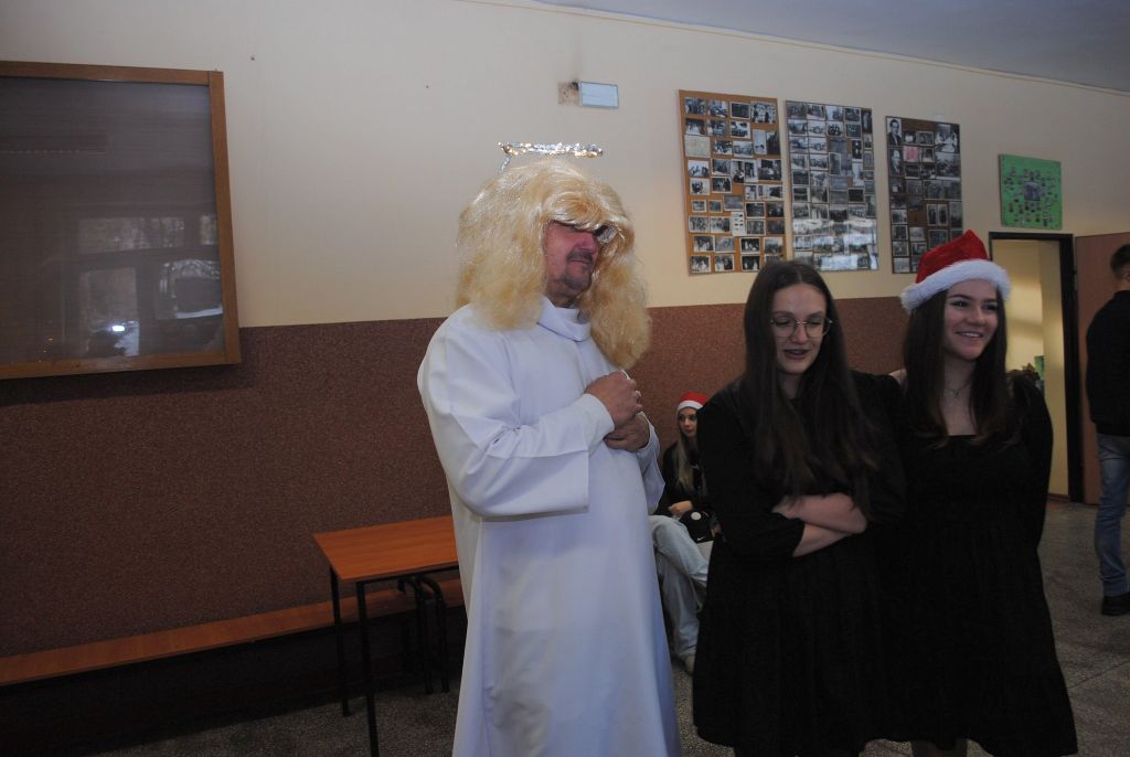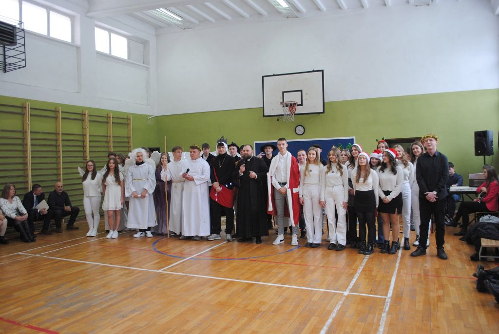Zgodnie z tradycją ostatniego dnia przed przerwą świąteczną w naszej szkole odbył się kiermasz bożonarodzeniowy. Na straganach przygotowanych przez poszczególne klasy znalazły się własnoręcznie wykonane ozdoby świąteczne, wypieki oraz dania kuchni polskiej i ukraińskiej. Cała społeczność szkolna mogła uczestniczyć w przepięknych jasełkach przygotowanych przez uczniów pod opieką księdza Michała Pietraszka. Jasełka to historia o Bożym Narodzeniu, rodzaj widowiska wpisanego w naszą tradycję. Wprowadziły nas one w świąteczny czas oczekiwania i zadumy. Wigilie klasowe stanowiły uwieńczenie tego magicznego czasu. W kameralnej atmosferze uczniowie składali sobie życzenia, dzielili się opłatkiem i kosztowali dania wigilijne. Dzięki wspólnemu zaangażowaniu ten dzień był wyjątkowy, bardzo ciepły, choć grudniowy, w którym gasną wszystkie spory, w którym radość wita wszystkich. Dzień, który każdy z nas zna od kołyski.