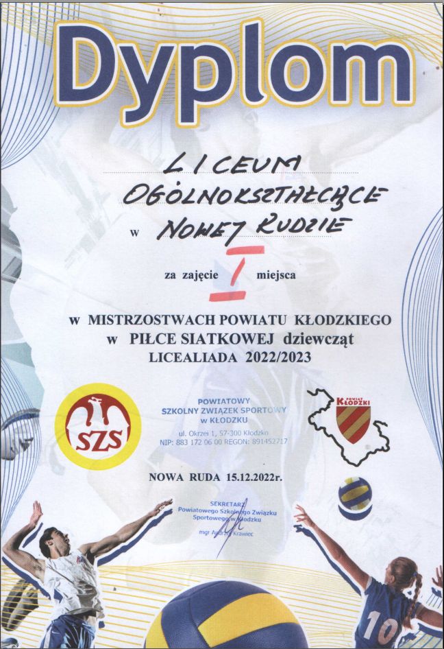 W dniu 15 grudnia na hali sportowej CTS Nowa Ruda - Słupiec odbyły się Mistrzostwa Powiatu Szkół Średnich Dziewcząt w piłce siatkowej. W Turnieju wystartowało 8 zespołów. Z bardzo dobrej strony pokazał się nasz zespół wygrywając swoją grupę i wychodząc z pierwszego miejsca. Rewelacyjny finał zanotowały nasze dziewczyny pokonując ekipę I LO Kłodzko. Po emocjonujących i czasami kontrowersyjnych sytuacjach boiskowych nasze wszystkie obecne dziewczyny w składzie: Emilia Gaik, Natalia Czerwińska, Martyna Horodecka, Karolina Cergier, Maja Myga, Julia Szydełko, Ines Szydełko, Amelia Drucia, Patrycja Stygar, Karolina Białek, Joanna Norek, Wiktoria Borkowska, Kornelia Kowaliczek ,Nadia Tumiło stanęły na wysokości zadania i zdobywając I miejsce, awansowały do strefy wałbrzyskiej, która odbędzie się 24 stycznia w Świdnicy. Gratulujemy!