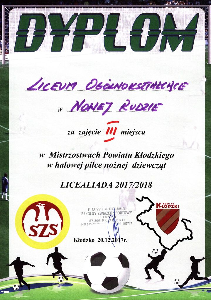 Młodzież Liceum Ogólnokształcącego w Nowej Rudzie uczestniczyła w LICEALIADZIE MŁODZIEŻY, w halowej piłce nożnej dziewcząt i chłopców, która odbywała się w dniach od 20-21.12.2017r. W zawodach łącznie wystartowało 12 drużyn szkół ponadgimnazjalnych z powiatu kłodzkiego .Rozegrano 21 meczów systemem mieszanym. Zawody rozgrywano na halach sportowych w Kłodzku (dziewczęta) i w Słupcu (chłopcy). Drużyna dziewcząt w składzie: Klaudia Ekielska, Weronika Kmita, Anna Staniszewska, Izabella Szymańska i Aleksandra Oleksińska zajęły III miejsce. Panowie również uplasowali się na III miejscu. Drużynę męską reprezentowali: Krzysztof Białek, Krystian Bolek, Konrad Borek, Kornel Grzesiak, Kacper Kancelarz, Jan Kwolik, Krystian Małkowski ,Filip Safader, Kamil Wojtoszek. |