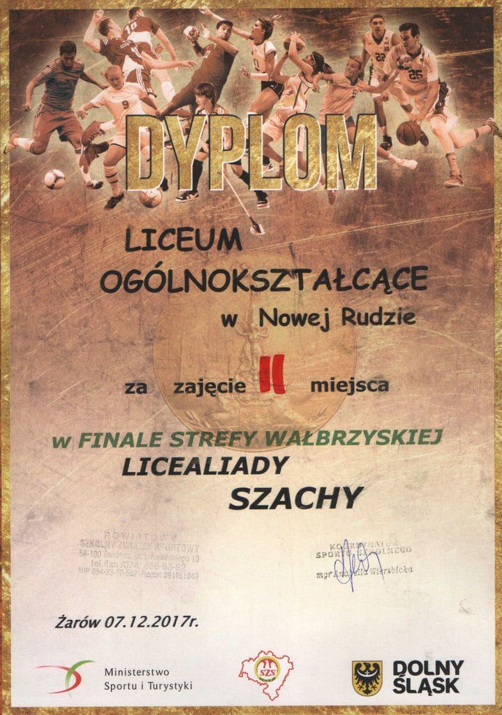 Po sukcesie w finale powiatowym szachiści noworudzkiego ogólniaka poszli o krok dalej i w silnie obsadzonym turnieju o mistrzostwo strefy wałbrzyskiej zajęli doskonałe drugie miejsce. Zawody rozgrywane w ramach Licealiady szkół ponadgimnazjalnych odbyły się 7 grudnia 2017r. w Gimnazjum w Żarowie, a drużyna Liceum Ogólnokształcącego w Nowej Rudzie wystąpiła w składzie: Michał Szydełko, Eryk Woźniak, Krzysztof Krugły i Paula Janowicz. Wynik ten dał awans do finału dolnośląskiego. Gratulujemy i trzymamy kciuki! |