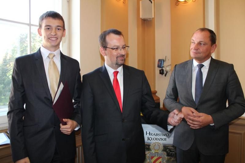 24 września 2014 roku podczas sesji Rady Powiatu Kłodzkiego Starosta, pan Maciej Awiżeń, oraz Przewodniczący Rady Powiatu Kłodzkiego, Dariusz Kłonowski, uroczyście wręczyli dyplomy i odznaki uczniom szkół powiatowych, którzy otrzymali stypendium przyznane w ramach Powiatowego Programu Stypendialnego DISCIPULUS EXEMPLORUM. Nagrody pieniężne są  przyznawane za szczególne osiągnięcia naukowe, sportowe lub zaangażowanie społeczne. Wśród laureatów znaleźli się uczniowie Liceum Ogólnokształcącego w Nowej Rudzie: Wojciech Pawlina z klasy IIIa oraz tegoroczni absolwenci Michał Stępniak i Wojciech Arabucki. Każdy z nich otrzymał stypendium w wysokości 2000 złotych. Podziękowania od władz powiatu odebrali również nauczyciele i dyrektorzy szkół, do których uczęszcza lub uczęszczała wyróżniona młodzież. Wszystkim serdecznie gratulujemy i życzymy kolejnych sukcesów.