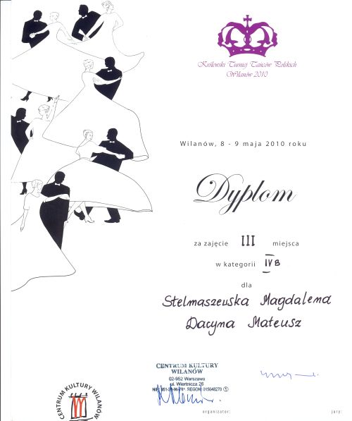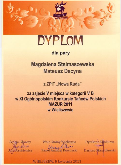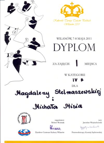 W dniach 7-8 maja br. Tancerze z „ZPIT Nowa Ruda” wzięli udział w „Królewskim Turniejów Tańców”. Polskich Wilanów 2011”. Wśród par biorących udział w ogólnopolskim turnieju znalazło się dwoje uczniów naszej szkoły. Magdalena Stelmaszewska uczennica kl. 1a i Michał Miś uczeń kl. 1d debiutowali w kategorii IV (16 -18 lat) zajmując 1 miejsce. Życzymy dalszych sukcesów.
