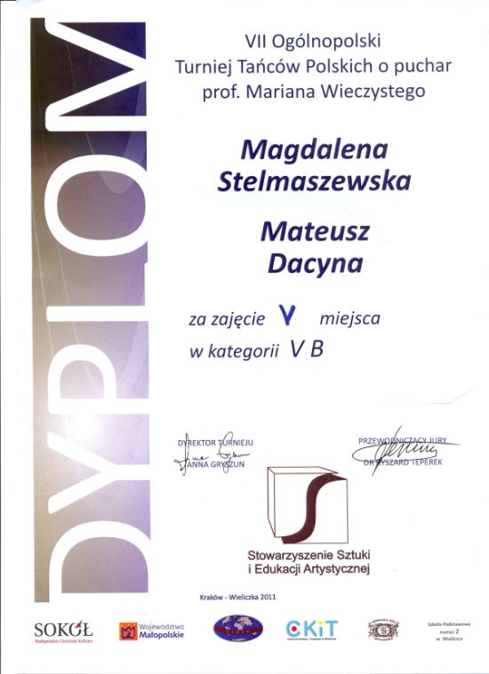 Mateusz Dacyna uczeń kl. 3b wraz z Magdaleną Stelmaszewską kl. 1a, brali udział w Ogólnopolskich Turniejach Tańców Polskich w Formie Towarzyskiej. Mimo uczestnictwa w zaledwie trzech turniejach zajmowali wysokie miejsca w finale. W Wilanowie w kategorii IV (16 - 18lat) uplasowali się na III miejscu. Zmieniając kategorię wiekową na V (18 - 30 lat) zajęli V miejsce w Wieliczce oraz V w Wieliszewie.