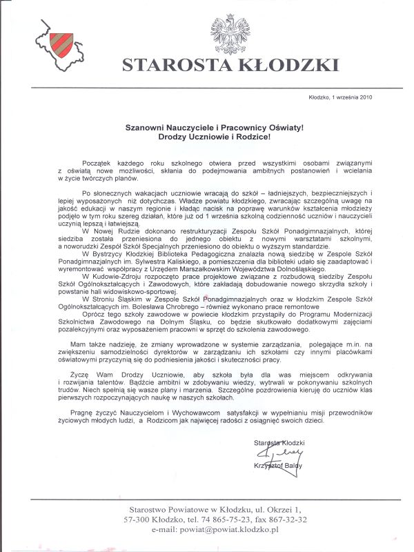 Uroczyste rozpoczęcie roku szkolnego 2010/11 odbyło się dnia 1 września na placu przed wejściem do budynku. Ze względu na pogodę przebiegło szybko i sprawnie. Dyrektor mgr Marzanna Pietrzak przedstawiła wychowawców nowo przybyłym klasom pierwszym oraz odczytała treść listu od Starosty Kłodzkiego Krzysztofa Baldego. Po krótkim apelu młodzież wraz z wychowawcami rozeszła sie do klas, gdzie zostali zapoznani z aktualnym planem lekcji.
